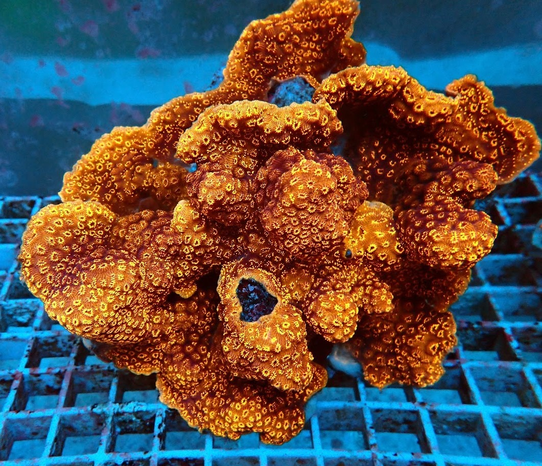Ten intensywnie pomarańczowy koralowiec to prawdziwa ozdoba każdego akwarium rafowego. Pavona maldivensis wyróżnia się barwnymi, falującymi strukturami, które pięknie odbijają światło, nadając zbiornikowi żywy i naturalny wygląd. W sprzyjających warunkach tworzy efektowne, nieregularne kolonie przypominające płaty koralowej tkanki.