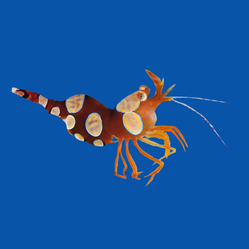 Ubarwienie: Ciało krewetki ma zazwyczaj oliwkowo-brązowy lub rdzawy odcień, ozdobiony symetrycznymi, dużymi, białymi lub opalizującymi plamami z cienkimi, niebieskimi lub fioletowymi obwódkami.